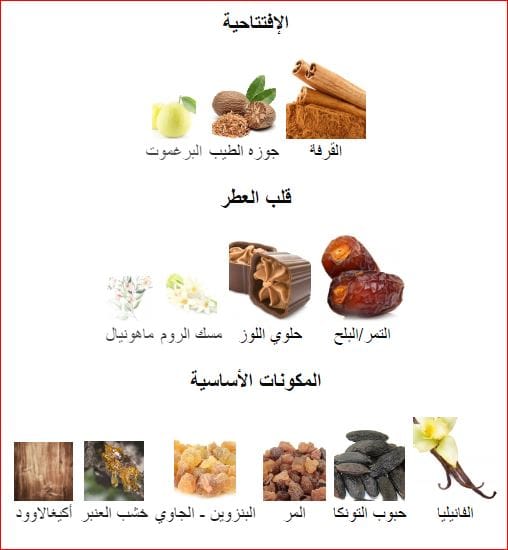 قاعدة العطر : تتكون من رائحة الفانيليا وحبوب التونكا والمر والبنزوين والاكيغالاوود وخشب العنبر