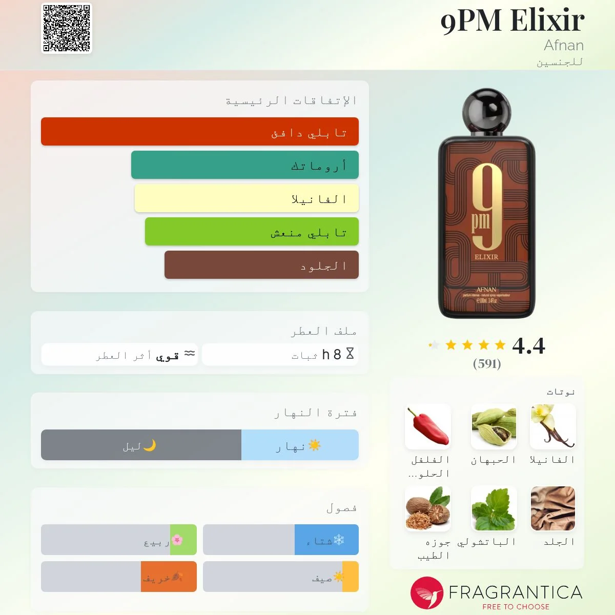 9PM Elixir هو سيمفونية آسرة من الدفء والعمق والجاذبية الراقية. يبدأ بتوابل مشرقة تمنحه لمسة نابضة وغامضة في آن واحد، ممهدًا لأجواء عطر يفرض حضوره منذ اللحظة الأولى. ينفتح على وهج دافئ متبّل يخطف الانتباه، لينساب بعده قلبٌ ناعم بنفحات عطرية خفيفة يلفّه دخان رقيق يضيف إليه لمسة من الأناقة الغامضة. ومع استقراره على البشرة، تظهر طبقات غنية وكريمية، تاركة أثرًا عميقًا، حسيًا، وجذابًا بشكل لا يقاوم. عطر راقٍ وإدماني، صُمم لمن يتحركون بثقة وسلاسة خلال أمسياتهم، ويتركون بصمتهم أينما ذهبوا.