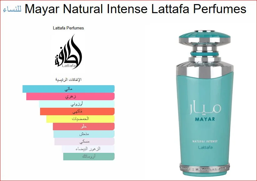 Mayar Natural Intense Lattafa Perfumes عطر للنساء . هذا عطر جديد Mayar Natural Intense صدر عام 2024. إفتتاحية العطر الماندرين الأحضر, شمام, ثمار التين و ماء جوز الهند; قلب العطر اللوتس, زنبق الماء و الياسمين; قاعدة العطر تتكون من الأمبروكسان, المسك, خشب الصندل و الفانيليا.