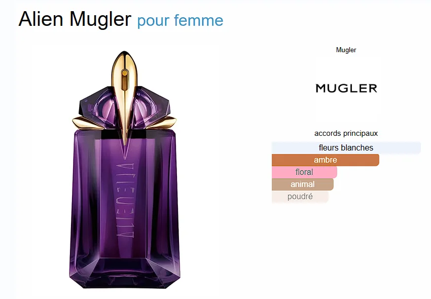 Alien de Mugler est un parfum Ambre boisé pour femme. Alien a été lancé en 2005. Alien a été créé par Dominique Ropion et Laurent Bruyere. La note de tête est Jasmin; la note de coeur est Notes boisées; la note de fond est Ambre.