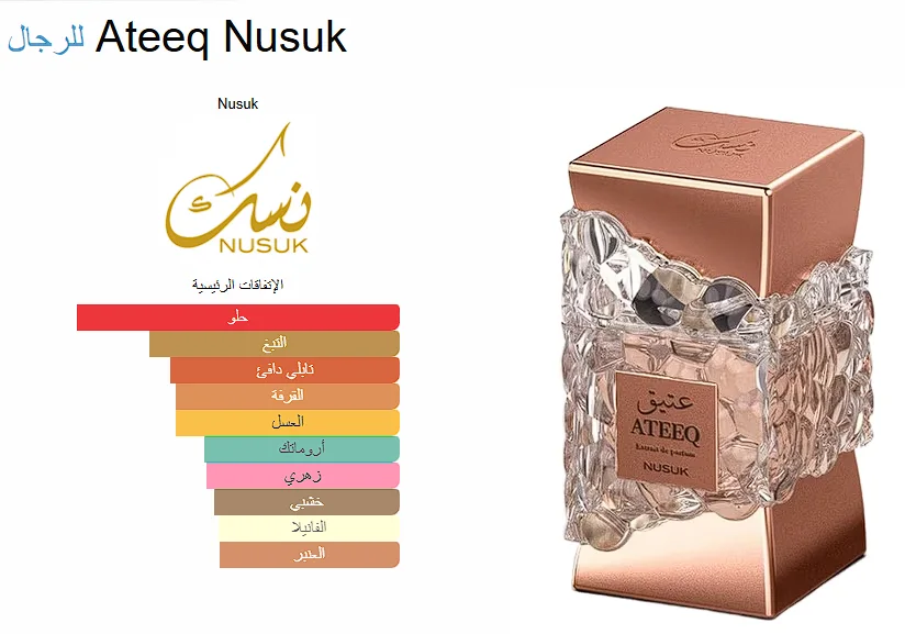 Ateeq Nusuk عطر أروماتك للرجال . هذا عطر جديد Ateeq صدر عام 2025. إفتتاحية العطر القرفة, العسل, العنبر, الجريب فروت و الليم; قلب العطر التبغ, الخزامي و الياسمين; قاعدة العطر تتكون من حبوب التونكا, خشب الأرز, أوركيد الفانيلا, الكومارين و المسك.