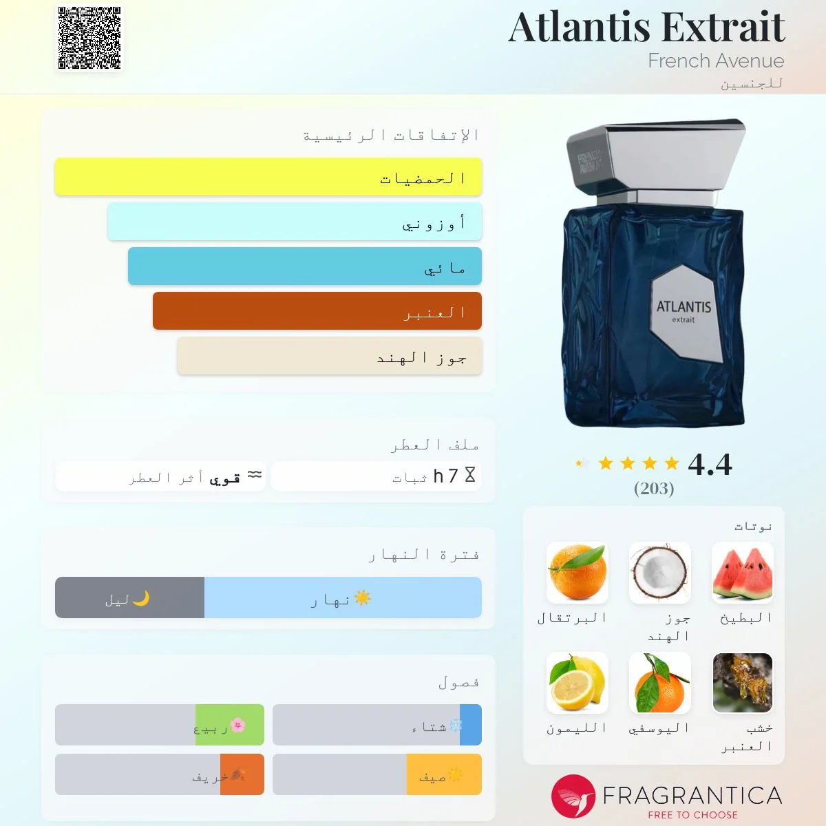 يبدأ العطر بانفجار حمضي منعش يوقظ الحواس بمزيج من الليمون واليوسفي والبرتقال، وكأنك تستقبل نسيم البحر في صباح مشرق. سرعان ما يأخذك القلب إلى شواطئ الجزر الاستوائية بنوتات حلوة ومائية من البطيخ وجوز الهند، ليضفي شعوراً بالبهجة والاسترخاء.