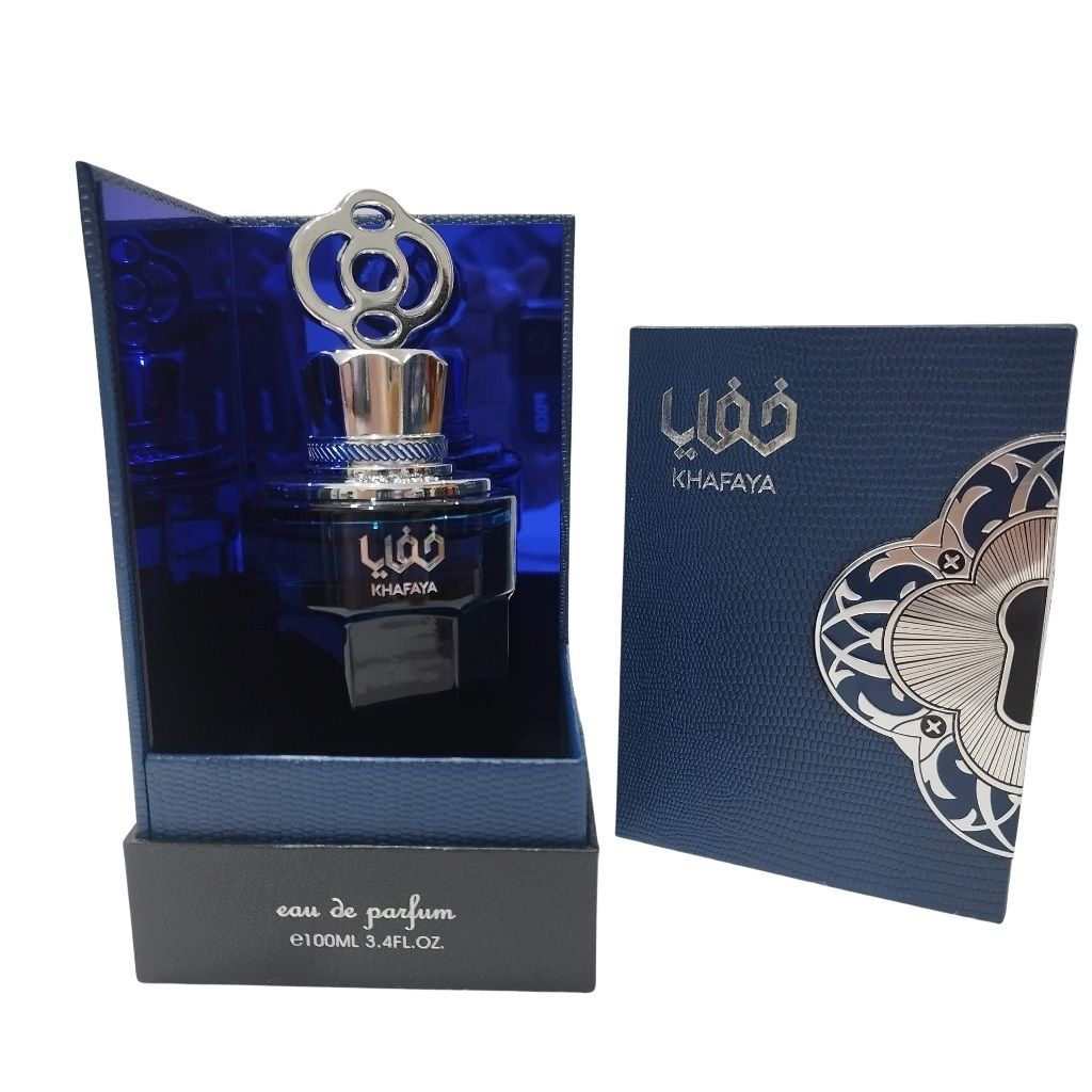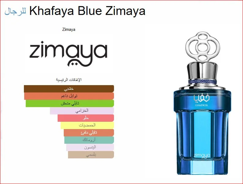 Khafaya Blue Zimaya عطر شرقي - خشبي للرجال . هذا عطر جديد Khafaya Blue صدر عام 2023. إفتتاحية العطر جوزه الطيب, الجريب فروت و القرفة; قلب العطر الخزامي و الأخشاب; قاعدة العطر تتكون من العرقسوس, خشب الصندل و العنبر.