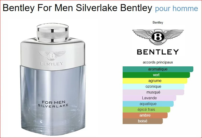 Bentley For Men Silverlake de Bentley est un parfum aromatique et épicé pour homme. Lancé en 2020, il se compose de notes de tête de citron et de menthe ; de notes de cœur de feuilles de violette, de lavande et de poivre rose ; de notes de fond de musc blanc et de bois d’ambre.
