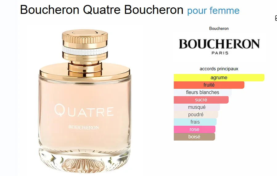 Boucheron Quatre de Boucheron est un parfum Floral fruité pour femme. Boucheron Quatre a été lancé en 2015. Boucheron Quatre a été créé par Natalie Gracia-Cetto, Nadege Le Garlantezec et Antoine Maisondieu. Les notes de tête sont Pamplemousse, Tangerine, Citron et Orange; les notes de coeur sont Jasmin, Pomme, Fraise, Rose et Pêche; les notes de fond sont Musc blanc, Bois de cachemire, Cèdre, Vanille et Caramel.