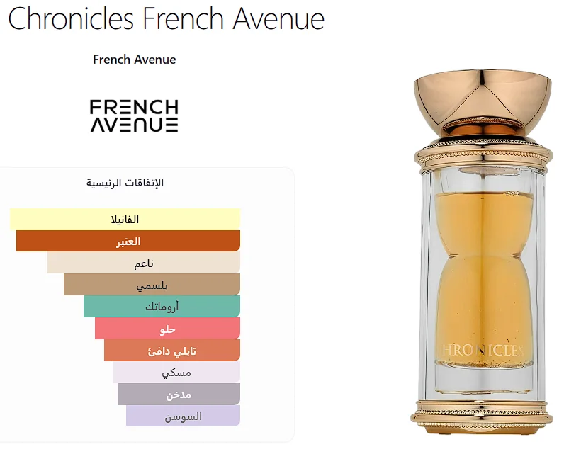 Chronicles French Avenue عطر شرقي - فانيليا للرجال . هذا عطر جديد Chronicles صدر عام 2025. إفتتاحية العطر راتنج الإليمي, المر و الفلفل الوردي; قلب العطر الهيلوتروب, البخور و السوسن; قاعدة العطر تتكون من حبوب التونكا, الفانيليا و المسك.