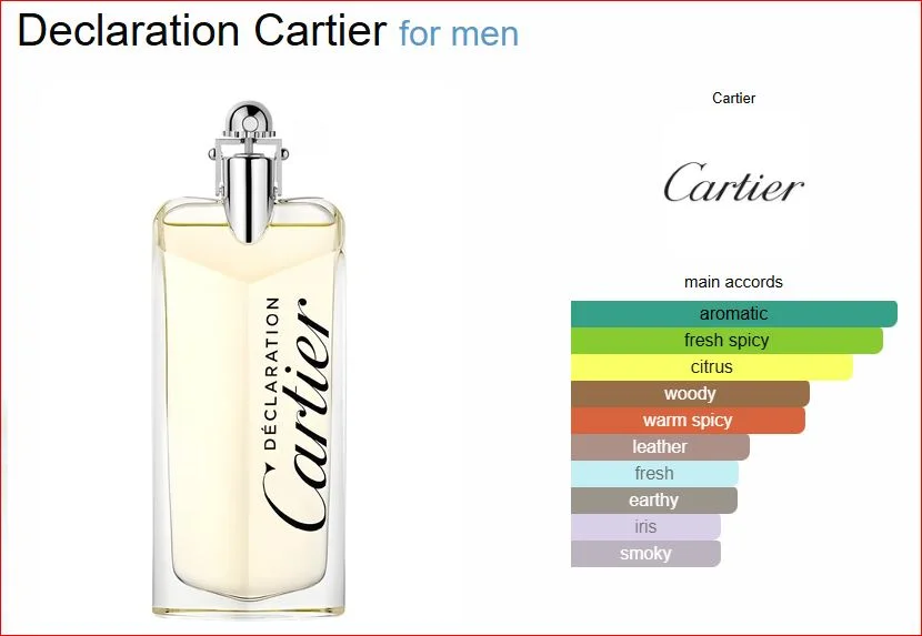 Declaration de Cartier est un parfum Boisé Floral Musqué pour homme. Declaration a été lancé en 1998. Le nez derrière ce parfum est Jean-Claude Ellena. Les notes de tête sont Bigarade, Carvi, Bouleau, Bergamote, Coriandre, Mandarine, Néroli et Armoise; les notes de coeur sont Cardamome du Guatémala, Poivre, Gingembre, Iris, Genévrier, Cannelle, Racine d’iris et Jasmin; les notes de fond sont Vétiver de Tahiti, Thé, Cèdre, Cuir, Mousse de chêne et Ambre.