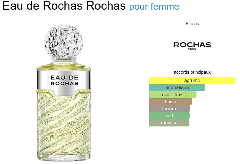 Eau de Rochas de Rochas est un parfum Hespéridé aromatique pour femme. Eau de Rochas a été lancé en 1970. Le nez derrière ce parfum est Nicolas Mamounas. Les notes de tête sont Citron vert, Citron, Basilic, Bergamote, Pamplemousse, Mandarine et Verveine; les notes de coeur sont Coriandre, Patchouli, Œillet, Narcissus, Jasmin et Rose sauvage; les notes de fond sont Mousse de chêne, Vétiver, Musc, Bois de santal et Ambre.