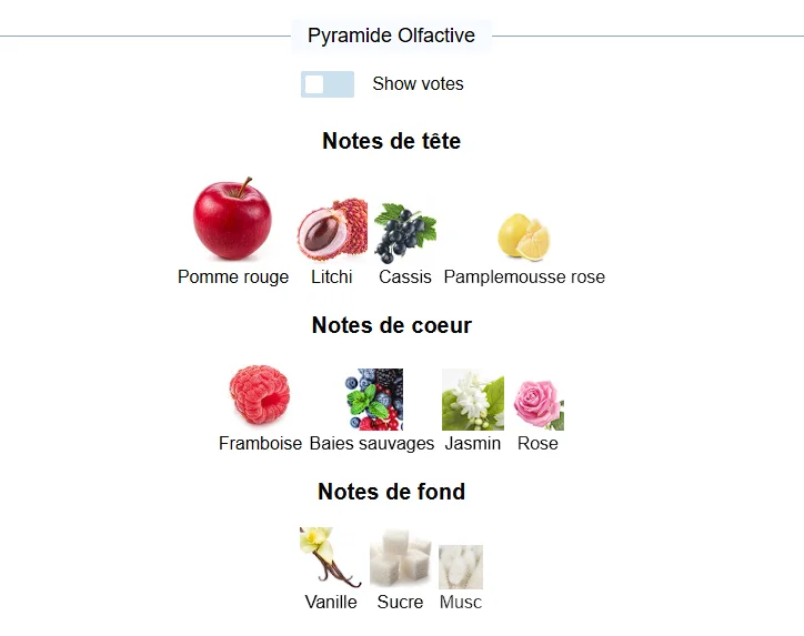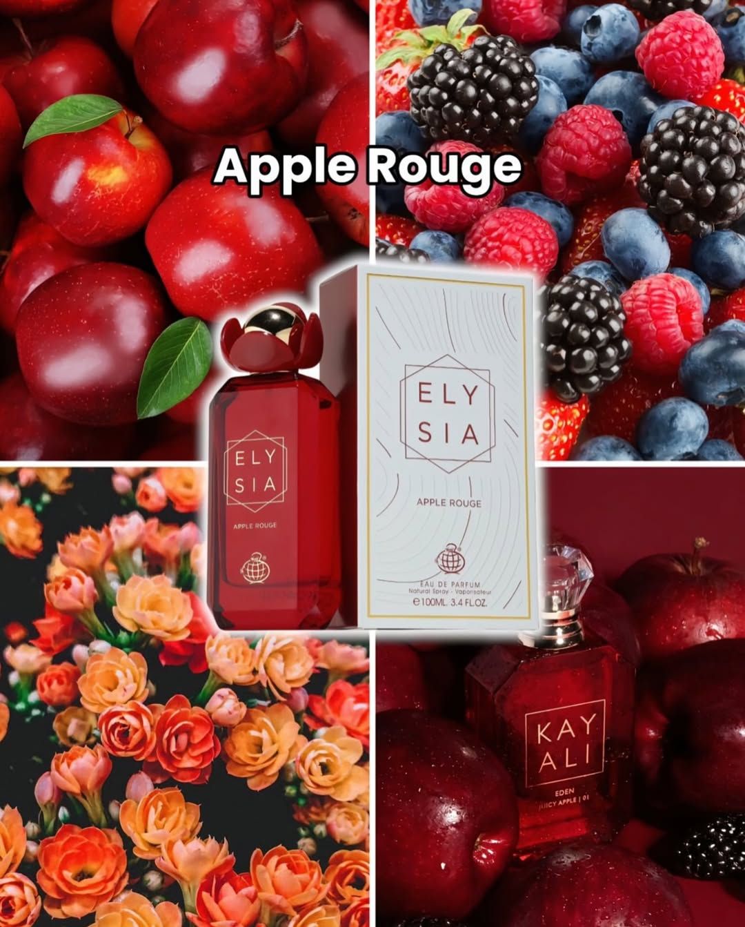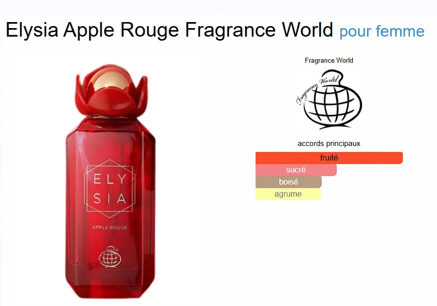 Elysia Apple Rouge de Fragrance World est un parfum Floral Fruité Gourmand pour femme. Elysia Apple Rouge a été lancé en 2024. Les notes de tête sont Pomme rouge, Litchi, Cassis et Pamplemousse rose; les notes de coeur sont Framboise, Baies sauvages, Jasmin et Rose; les notes de fond sont Vanille, Sucre et Musc.