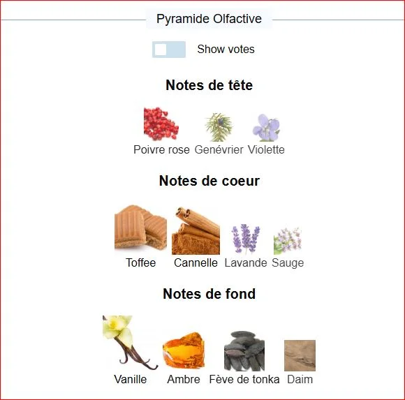 Les notes de tête sont Poivre rose, Genévrier et Violette; les notes de coeur sont Toffee, Cannelle, Lavande et Sauge; les notes de fond sont Vanille, Fève de tonka, Ambre et Daim.