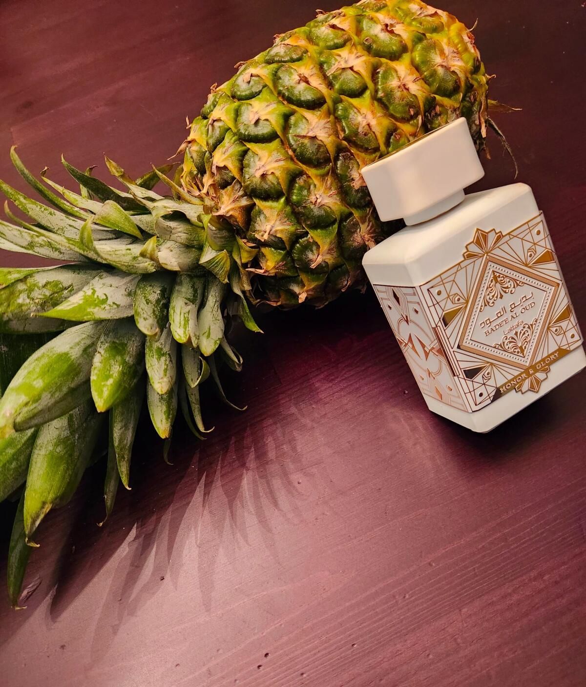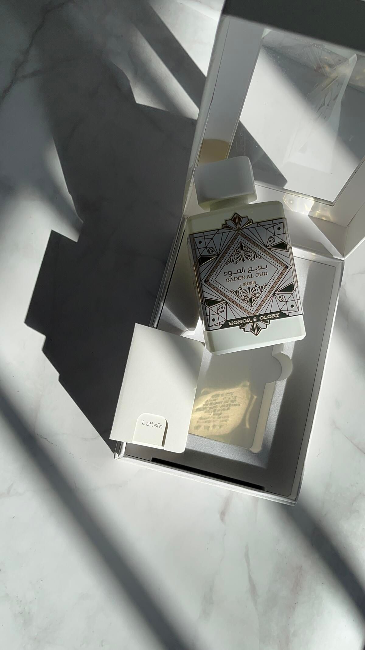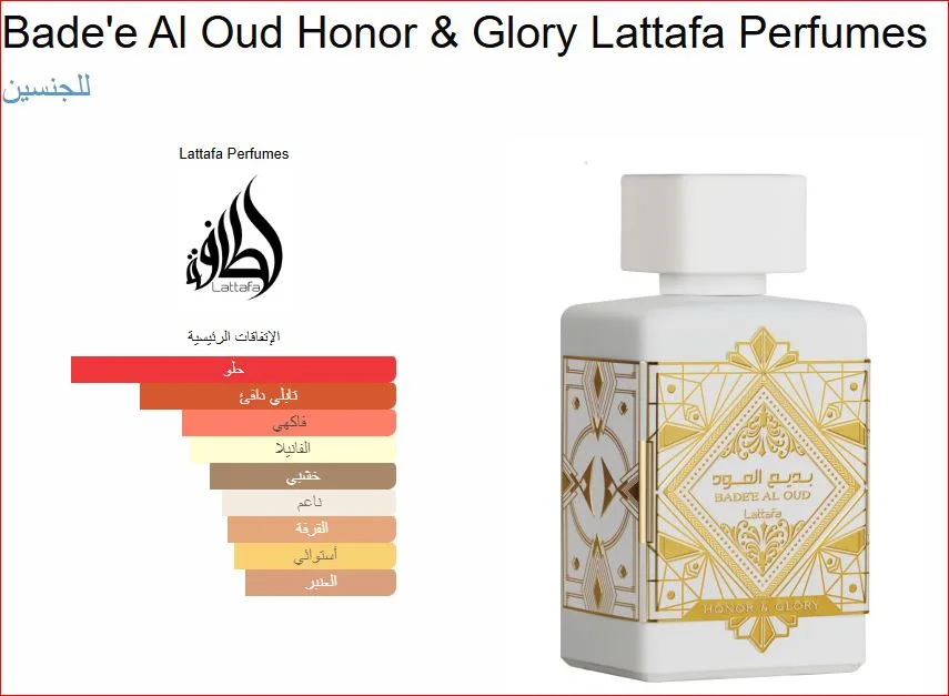 Bade'e Al Oud Honor & Glory Lattafa Perfumes عطر للجنسين. هذا عطر جديد Bade'e Al Oud Honor & Glory صدر عام 2023. إفتتاحية العطر الأناناس و حلوي الكريم بروليه; قلب العطر القرفة, الكركم, البنزوين - الجاوي و الفلفل الأسود; قاعدة العطر تتكون من الفانيليا, خشب الصندل, أخشاب الكشمير و الطحالب.