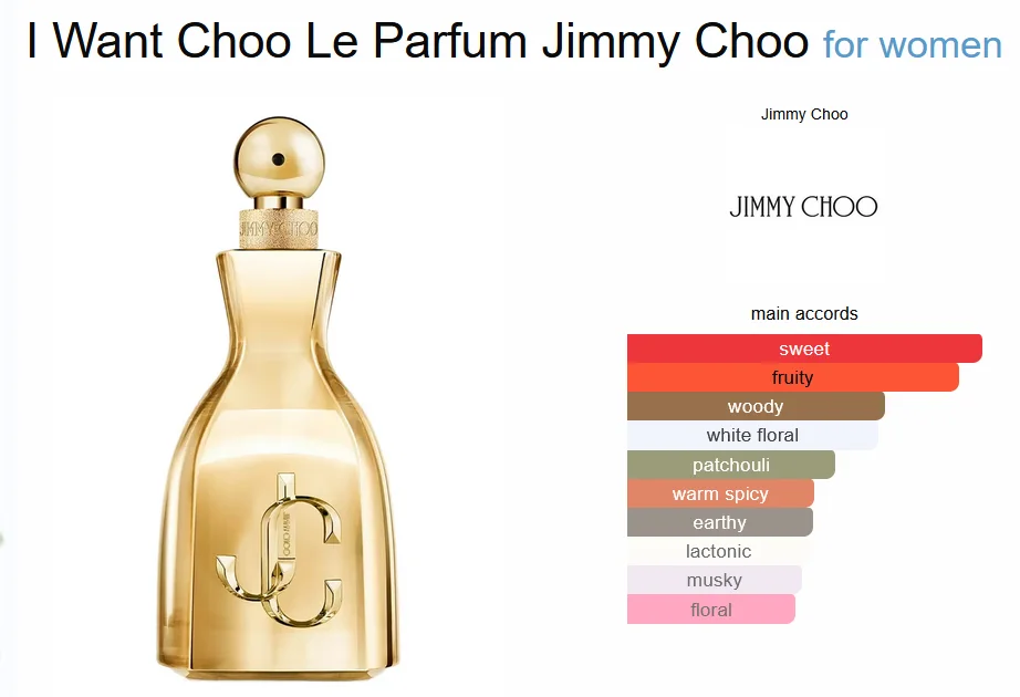 I Want Choo Le Parfum de Jimmy Choo est un parfum Floral Fruité Gourmand pour femme. Il s’agit d’un nouveau parfum. I Want Choo Le Parfum a été lancé en 2024. I Want Choo Le Parfum a été créé par Amandine Clerc-Marie et Marie Salamagne. Les notes de tête sont Mûre, Poire et Gardénia; les notes de cœur sont Patchouli, Jasmin et Ambrette; les notes de fond sont Praliné, Mousse et Bois de santal.