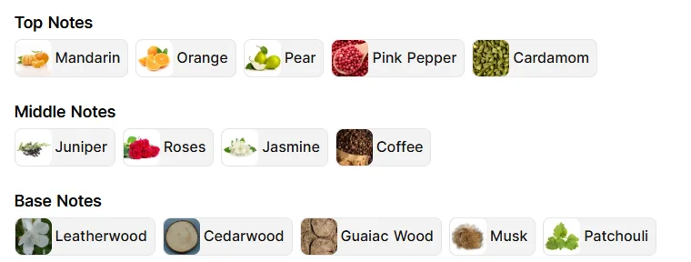 مزيج ساحر وغير تقليدي يجمع بين رائحة القهوة الغنية، والزهور الناعمة (الورد والياسمين)، ونكهة العرعر المميزة.