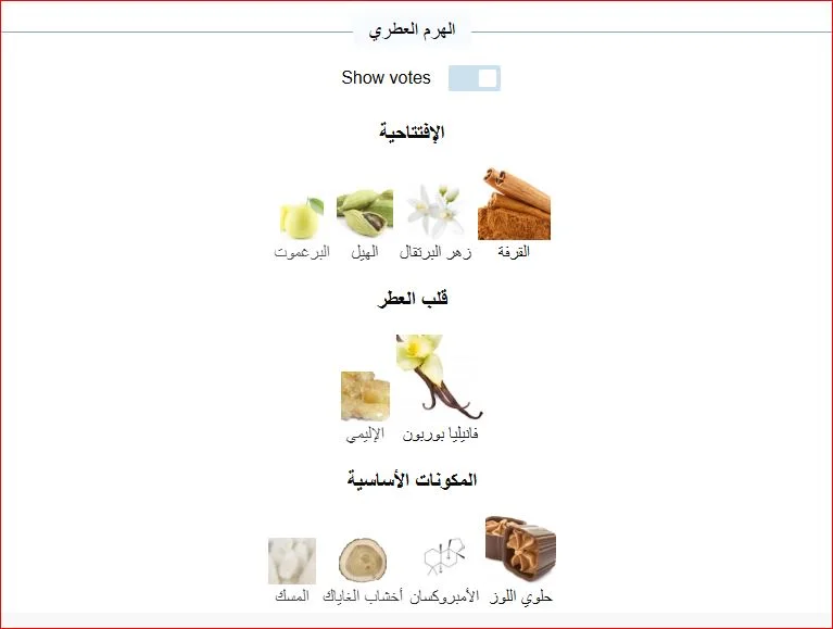 قاعدة العطر تتكون من حلوى اللوز، الأمبروكسان، أخشاب الغاياك والمسك.
