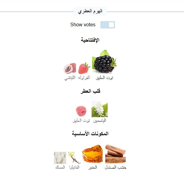 مقدمة العطر: توت العليق، الفراولة والليتشي قلب العطر: ياسمين السامباك والتوت الأحمر قاعدة العطر: الفانيليا، العنبر، خشب الصندل والمسك
