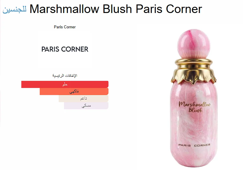 Marshmallow Blush Paris Corner عطر للجنسين. هذا عطر جديد Marshmallow Blush صدر عام 2025. إفتتاحية العطر الفراوله, توت العليق و الليمون; قلب العطر زهر البرتقال و الأمبروكسان; قاعدة العطر تتكون من المارشميللو و المسك.