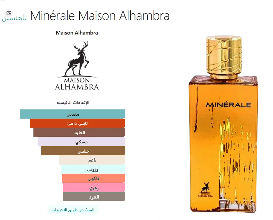 Minérale de Maison Alhambra est un parfum pour homme et femme. C'est un nouveau parfum. Minérale a été lancé en 2025. Les notes de tête sont Safran et Mandarine d'Italie; les notes de coeur sont Osmanthus, Feuille de violette et Immortelle; les notes de fond sont Notes minérales, Daim, Bois d'Akigala, Musc, Cèdre et Patchouli.
