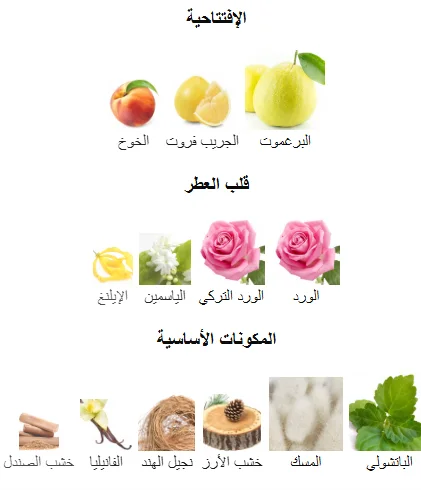 القاعدة: أساس قوي وثابت يجمع بين الباتشولي الترابي، المسك الناعم، الفانيليا الحلوة، مع لمسات خشبية من خشب الأرز والصندل ونجيل الهند.