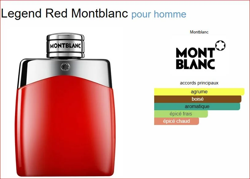 Legend Red de Montblanc est un parfum pour homme. Il s’agit d’une nouvelle fragrance lancée en 2022. Ses notes de tête sont l’orange sanguine, le pamplemousse et la cardamome ; ses notes de cœur sont le cèdre, la sauge sclarée et les baies de genièvre ; ses notes de fond sont le cèdre de l’Atlas, l’acajou et la fève tonka.