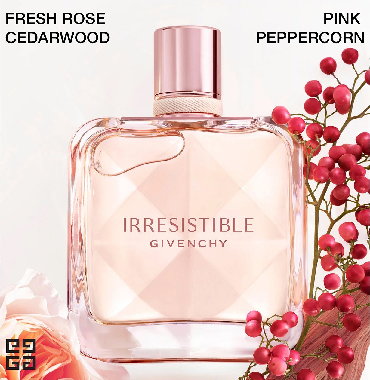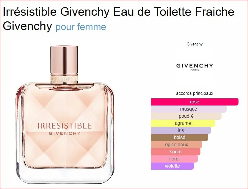 Irrésistible Givenchy Eau de Toilette Fraiche de Givenchy est un parfum Floral fruité pour femme. Irrésistible Givenchy Eau de Toilette Fraiche a été lancé en 2021. Les notes de tête sont Poivre rose et Orange; les notes de coeur sont Rose rouge de Turquie et Iris; les notes de fond sont Musc et Cèdre.