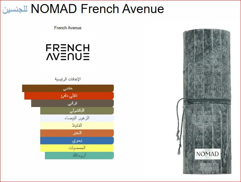NOMAD French Avenue عطر شرقي - خشبي للجنسين. هذا عطر جديد NOMAD صدر عام 2025. إفتتاحية العطر الزعفران و الليمون; قلب العطر الزهور البيضاء و ملاحظات بحرية; قاعدة العطر تتكون من الباتشولي, الفانيليا, السيبرول (الناجراموثا) و العنبر.