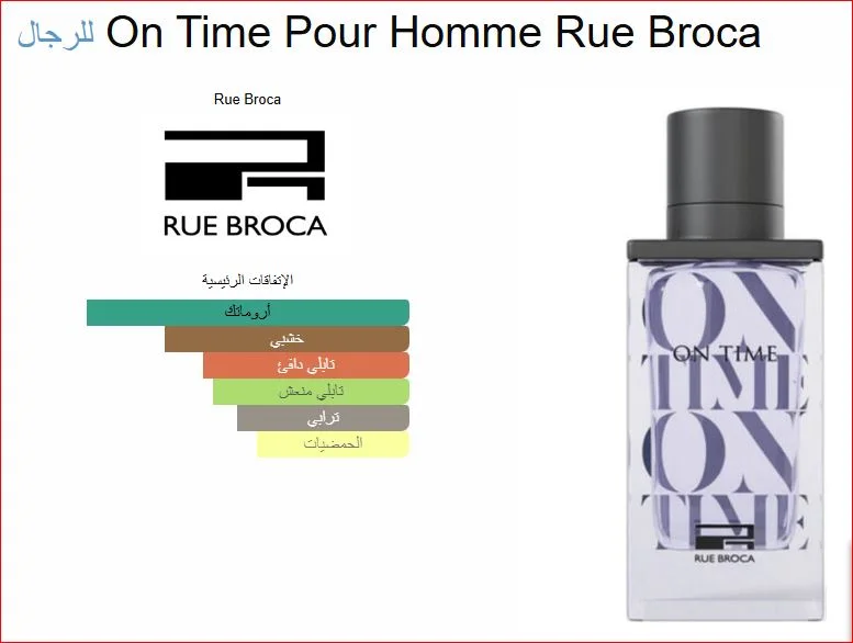 On Time Pour Homme Rue Broca عطر خشبي - أروماتك للرجال . هذا عطر جديد On Time Pour Homme صدر عام 2024. إفتتاحية العطر توت العرعر, الزنجبيل و البرغموت; قلب العطر الخزامي و المريمية; قاعدة العطر تتكون من نجيل الهند, الباتشولي و خشب الأرز.