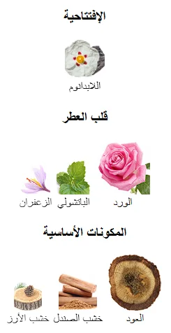 يبدأ بثوب من خشب العود الغامق، يتداخل مع وردة دمشقية كثيفة وحسّاسة تعكس سحرًا أنيقًا. إنه عطر ليلي راقٍ، يجمع بين الأصالة والفخامة، يتميّز بجاذبية قوية وسيلان عطر يترك أثرًا لا يُمحى. ينسجم الخشب والورد مع نفحات من البهارات والعنبر لتكوين توقيع عطرٍ فريد وشخصية لا تُنسى.
