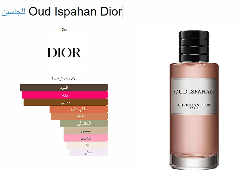 Oud Ispahan Dior عطر شرقي - زهري للجنسين. Oud Ispahan صدر عام 2012. François Demachy قام بتوقيع هذا العطر. إفتتاحية العطر اللابدانوم; قلب العطر الورد, الباتشولي و الزعفران; قاعدة العطر تتكون من العود, خشب الصندل و خشب الأرز.