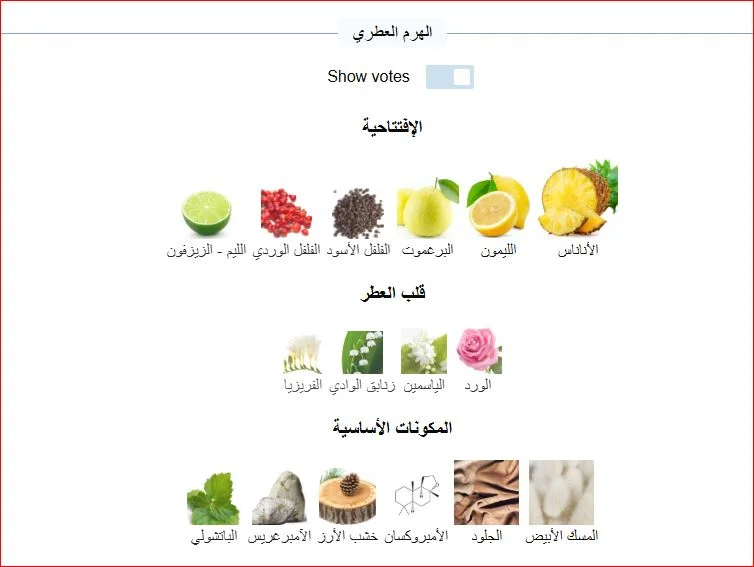 الأناناس, الليمون, البرغموت, الفلفل الأسود, الفلفل الوردي و الليم - الزيزفون; قلب العطر الورد, الياسمين, زنابق الوادي و الفريزيا; قاعدة العطر تتكون من المسك الأبيض, الجلود, الأمبروكسان, خشب الأرز, الآمبرغريس و الباتشولي.