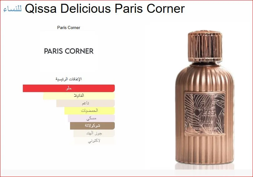 عطر "Qissa Delicious" من باريس كورنر هو عطر نسائي ينتمي إلى عائلة العطور الزهرية الفاكهية الغورماندية. تم إصداره في عام 2024. يتميز هذا العطر بمزيج مغري من النوتات الحلوة والمغرية التي تخلق تجربة عطرية فريدة.