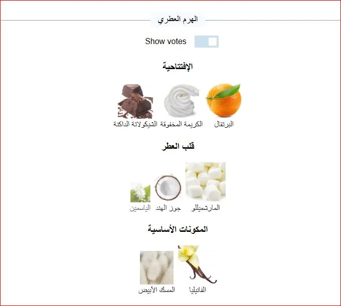 يبدأ العطر بمزيج حلو من البرتقال والشوكولاتة الداكنة والكريمة المخفوقة، مما يمنح إحساسًا بالدفء والحلاوة. ثم يتطور إلى قلب غني بجوز الهند والمارشميلو والياسمين، مضيفًا لمسة زهرية كريمية. في النهاية، تستقر الرائحة على قاعدة من الفانيليا والأخشاب الناعمة والمسك الأبيض، مما يضفي عمقًا وثباتًا على العطر.