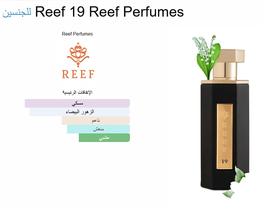 Reef 19 Reef Perfumes عطر للجنسين. إفتتاحية العطر زنابق الوادي; قلب العطر الياسمين; قاعدة العطر من المسك الأبيض.