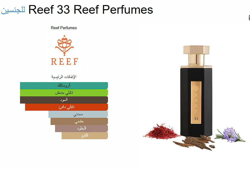 Reef 33 Reef Perfumes عطر شرقي - خشبي للجنسين. Reef 33 صدر عام 2020. Kevin Mathys قام بتوقيع هذا العطر. إفتتاحية العطر الزعفران الهندي; قلب العطر إكليل الجبل; قاعدة العطر من العود.