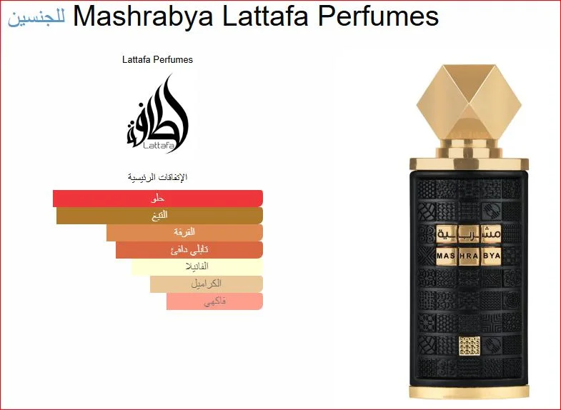 Mashrabya Lattafa Perfumes عطر شرقي - فانيليا للجنسين. هذا عطر جديد Mashrabya صدر عام 2024. إفتتاحية العطر Apple Shisha Accord و الفلفل الوردي; قلب العطر التبغ, القرفة و التمر/البلح; قاعدة العطر تتكون من Oud Smoke, الفانيليا, الكاراميل و الباتشولي.