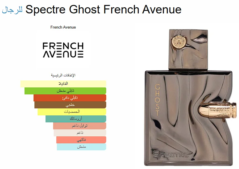 Spectre Ghost French Avenue عطر خشبي - أروماتك للرجال . هذا عطر جديد Spectre Ghost صدر عام 2023. إفتتاحية العطر الزنجبيل, الهيل و البرغموت; قلب العطر الفلفل الوردي, الكشمش الأسود و الورد; قاعدة العطر تتكون من الفانيليا, خشب الأرز و الباتشولي.