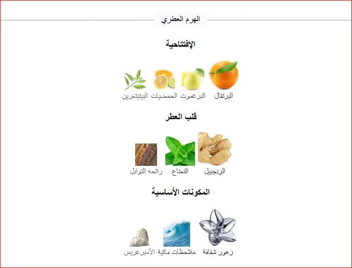 الروائح الوسطى : الزنجبيل ، زهر البرتقال التونسي ، قرفة سيلان ..