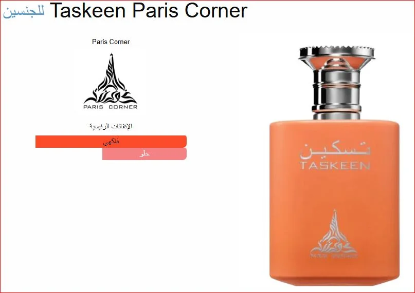 Taskeen Paris Corner عطر للجنسين. إفتتاحية العطر الخوخ, البرتقال الأحمر و الهيل; قلب العطر الياسمين, الدافانا, الكونياك و الهيلوتروب; قاعدة العطر تتكون من الفانيليا, البنزوين - الجاوي, خشب الصندل, أخشاب الكشمير, حبوب التونكا, الباتشولي و اللابدانوم.