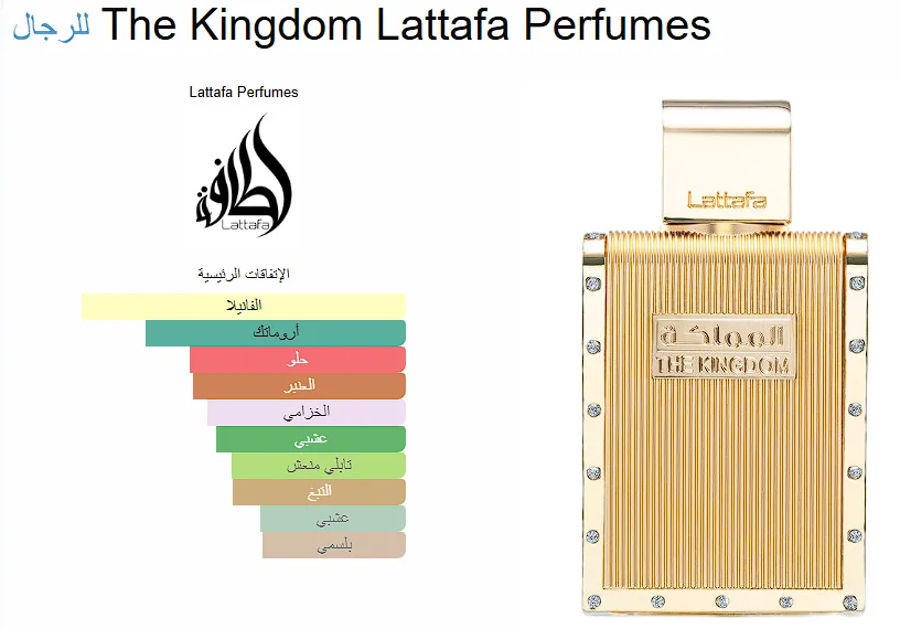 The Kingdom Lattafa Perfumes عطر أروماتك للرجال . هذا عطر جديد The Kingdom صدر عام 2024. إفتتاحية العطر الخزامي, النعناع و المريمية; قلب العطر الفانيليا, التبغ و زهر البرتقال; قاعدة العطر تتكون من حبوب التونكا, البنزوين - الجاوي و اللابدانوم.