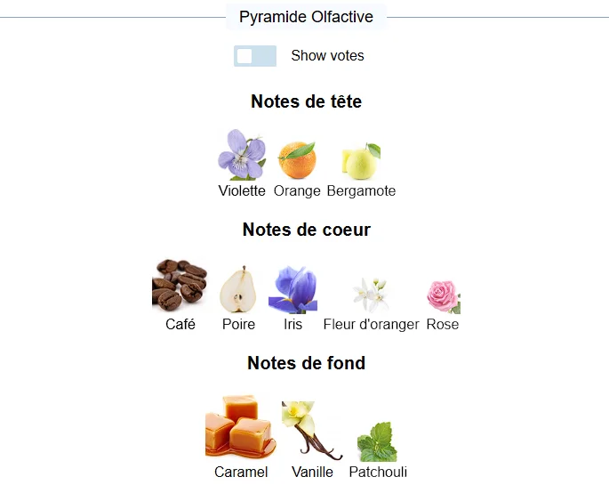 Le parfum s’ouvre par la violette mariée à de subtiles touches de bergamote pour créer un bouquet vif, frais et riche. Au coeur, de séduisantes notes de café intenses se mêlent à l’iris envoûtant. Enfin, la note de fond à base de vanille et patchouli lui confère un côté tactile et réconfortant qui enveloppe les sens dans une étreinte généreuse.