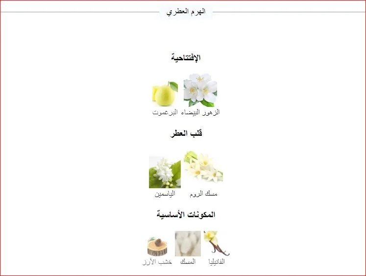 قاعدة العطر : تتكون من الفانيليا، المسك و خشب الأرز...
