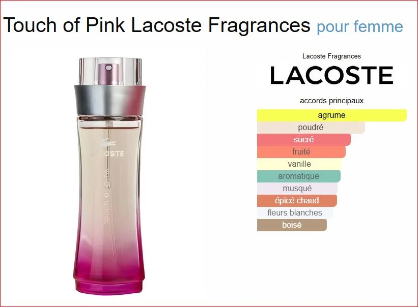 Touch of Pink de Lacoste Fragrances est un parfum Floral fruité pour femme. Touch of Pink a été lancé en 2004. Le nez derrière ce parfum est Domitille Michalon Bertier. Les notes de tête sont Orange, Pêche, Orange sanguine, Coriandre et Cardamome; les notes de coeur sont Jasmin, Coriandre, Cardamome, Feuille de violette et Graines de carotte; les notes de fond sont Vanille, Musc et Bois de santal