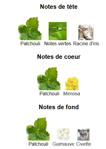 Notes de tête (Top Notes) : Vert, Patchouli, Iris