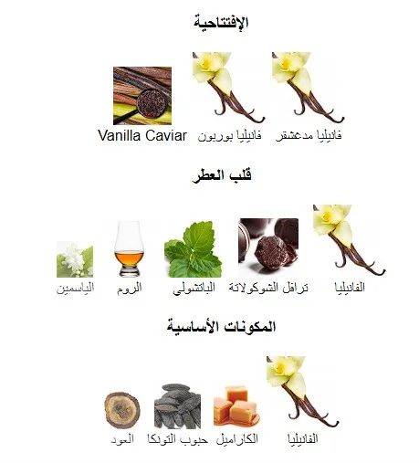 قاعدة العطر تتكون من الفانيليا, الكاراميل, حبوب التونكا و العود.